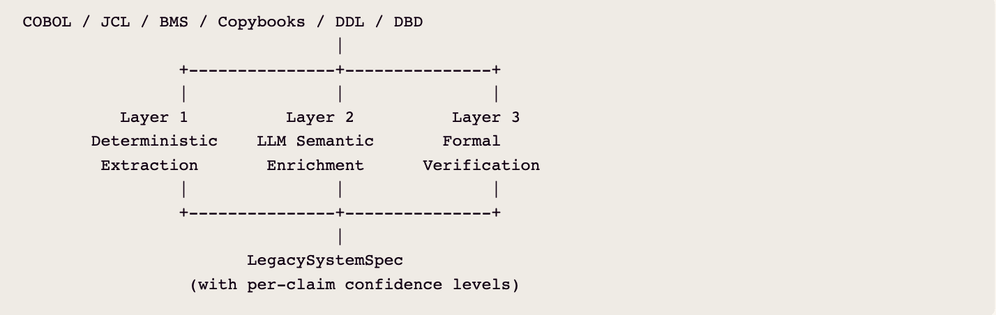 The result is a specification where every claim carries a provenance tag: deterministically extracted, LLM-inferred, or formally verified. A modernization team can trust the proven claims absolutely, review the inferred claims with appropriate skepticism, and prioritize manual review for the gaps.